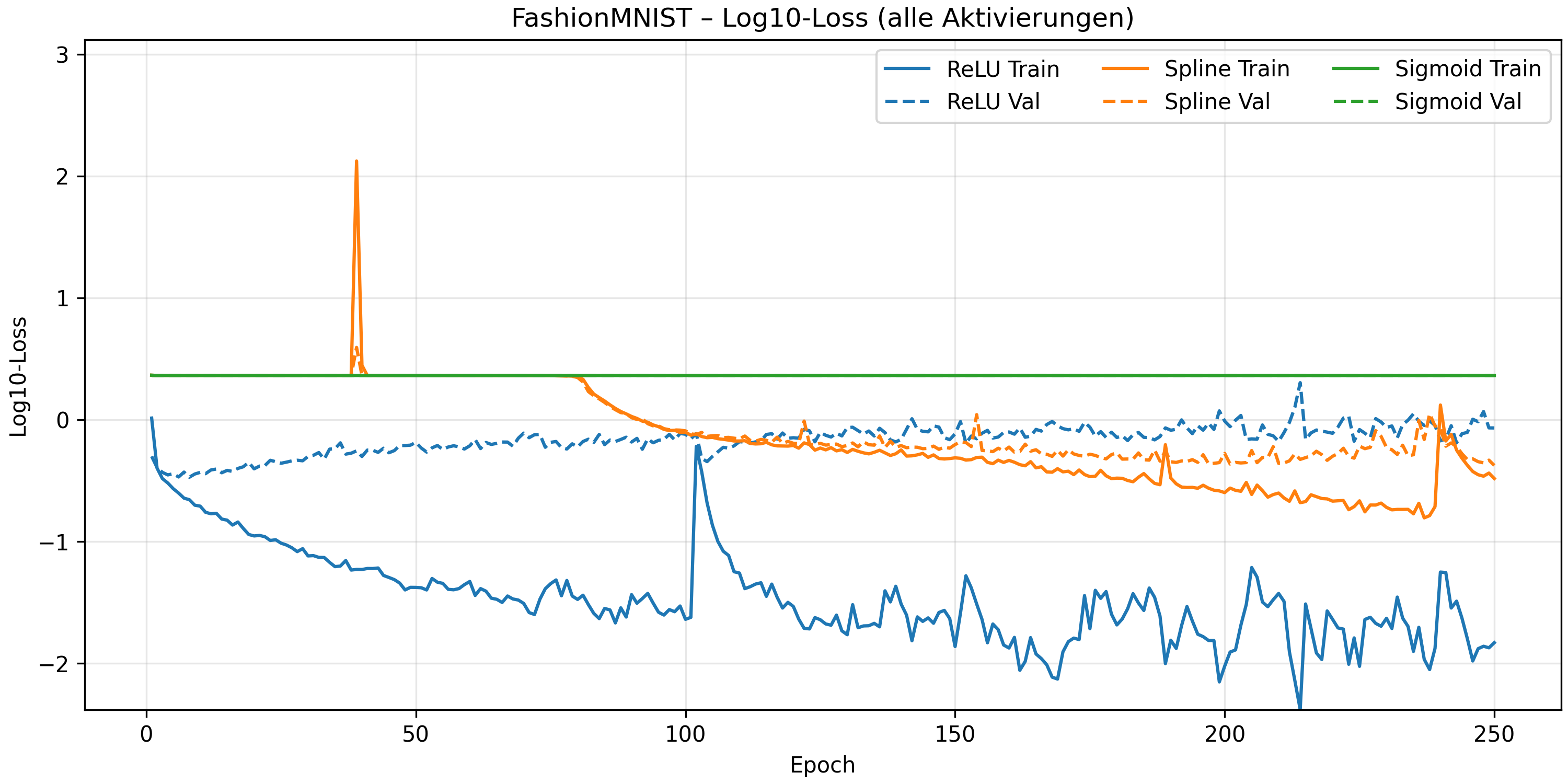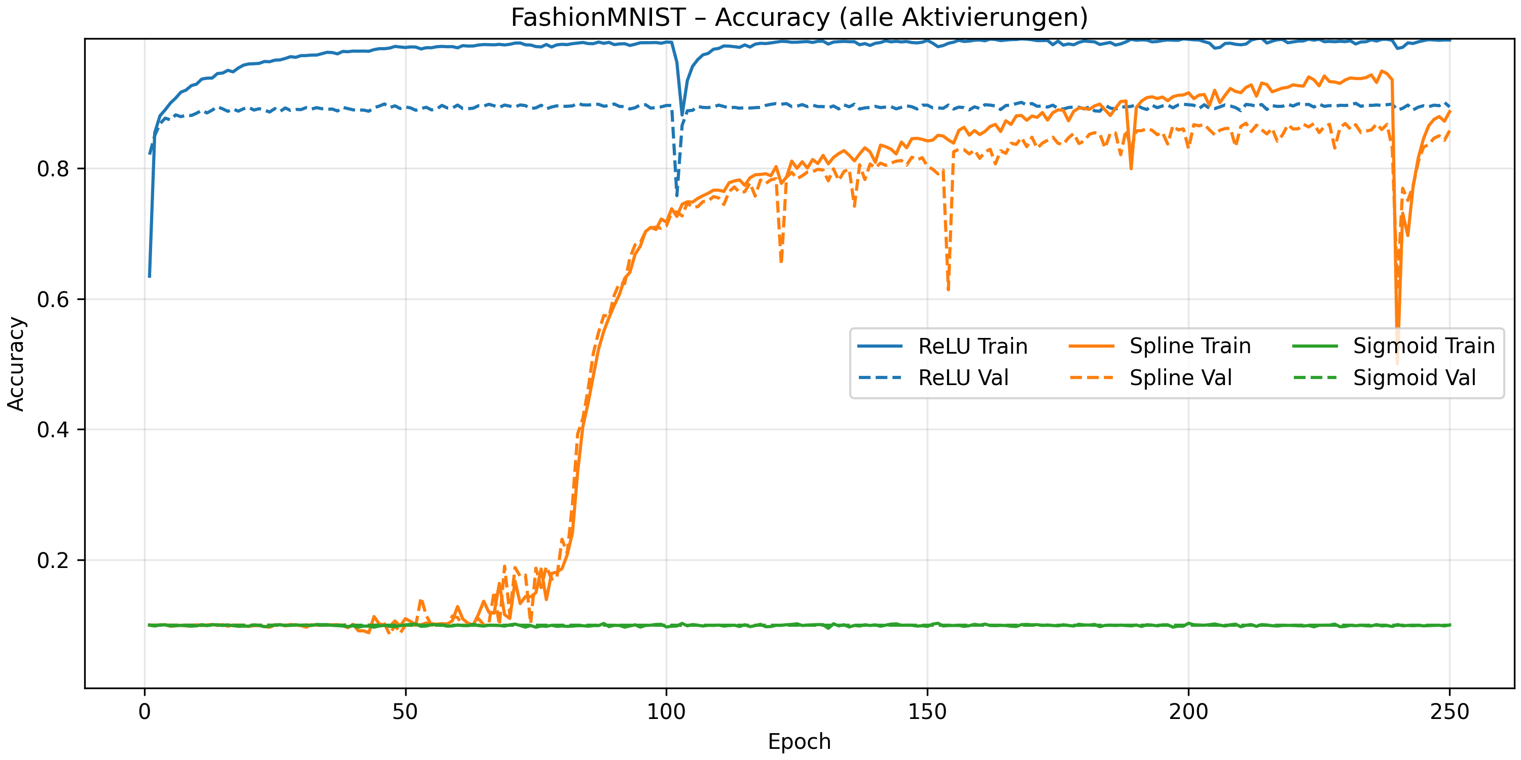 - Fairer Vergleich zwischen ReLU, klassischer Sigmoid und Spline-Sigmoid